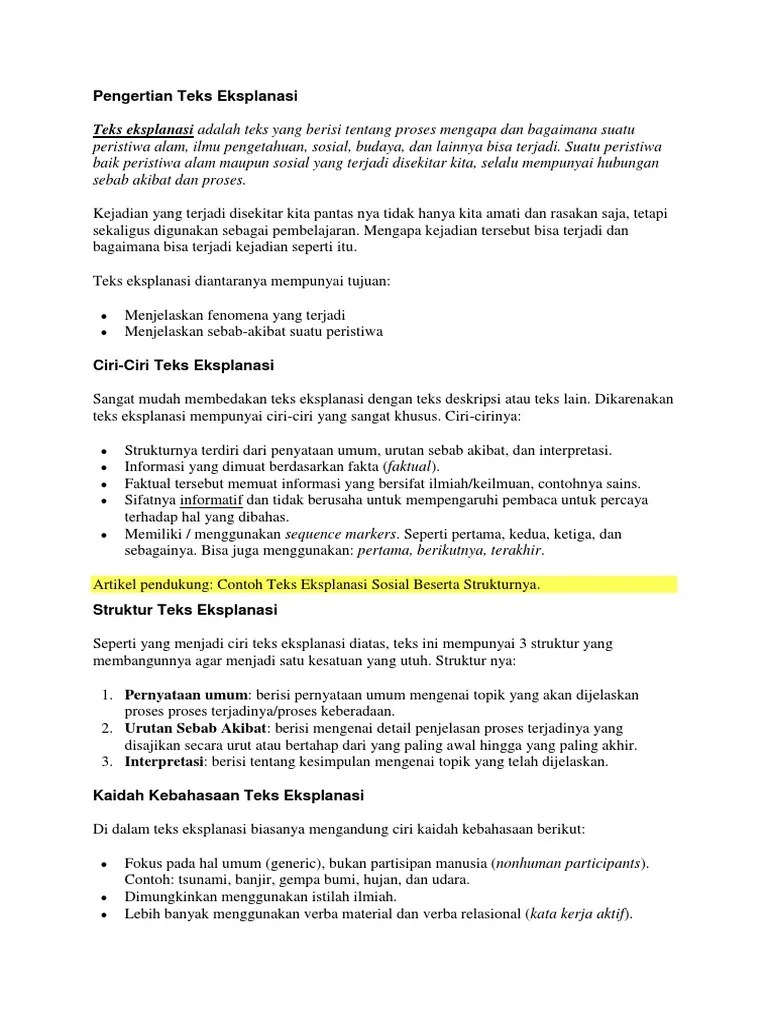 20 contoh teks eksplanasi yang sesuai struktur dan kaidah kebahasaan · informasi berdasarkan fakta (faktual). Teks eksplanasi juga bisa membahas fenomena sosial, politik. Teks eksplanasi pada umumnya mempunyai . Gempa bumi, gunung meletus, tsunami, badai, . Adapun beberapa kaidah kebahasaan teks eksplanasi adalah.